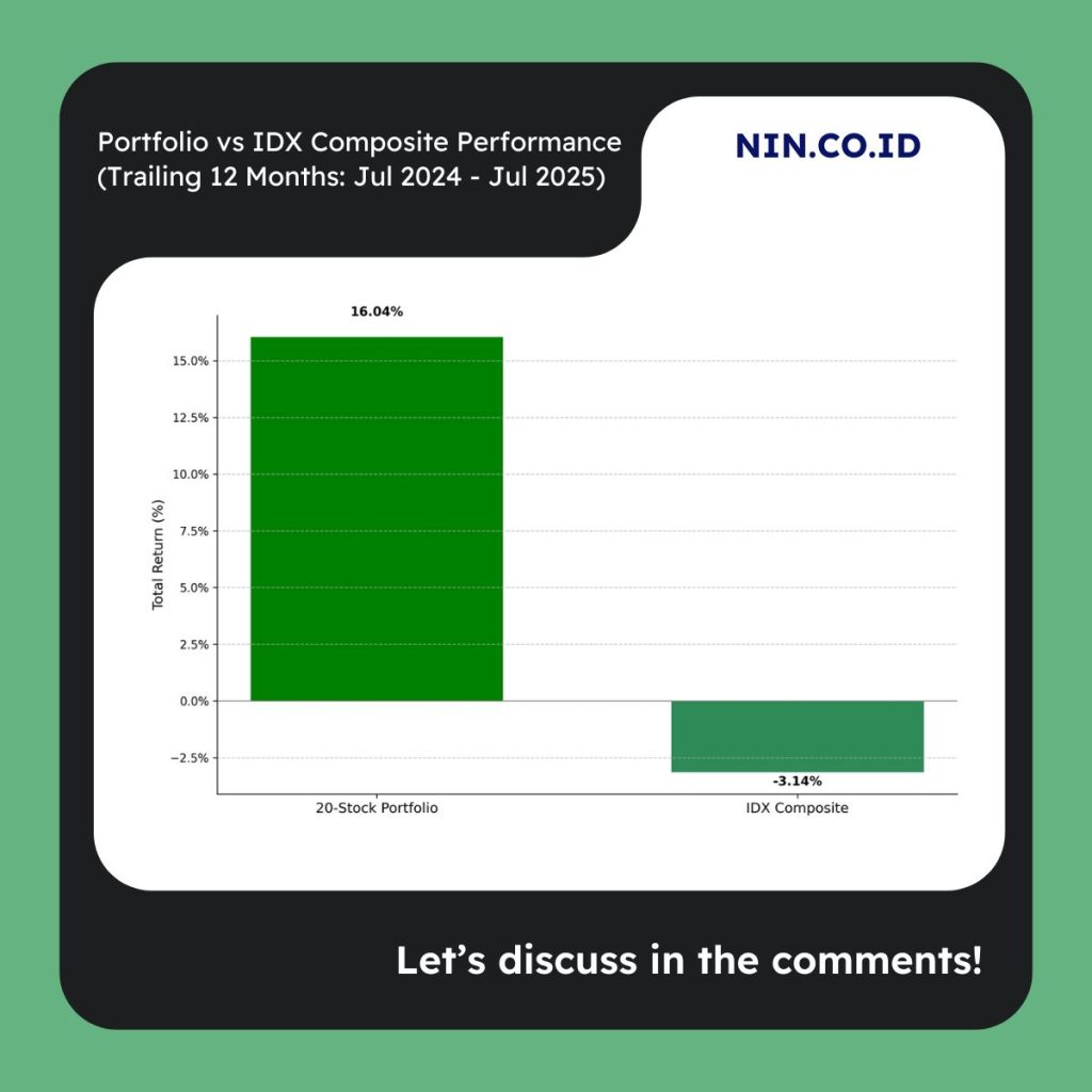 Do ESG Disclosures Correlate with Market Performance in Indonesia? Globally, the answer appears to be a resounding yes. CDP, the leading environmental disclosure platform, claims that companies on its prestigious “Climate A List” have consistently outperformed global stock indexes.But does this trend hold true in Indonesia? To find out, NIN put this to the test. Methodology & Source: Using a transparent and repeatable process, NIN analyzed an equal-weighted portfolio of 20 major Indonesian companies that disclosed their environmental data to CDP in 2024. The performance was calculated for the trailing 12-month period from July 1, 2024, to July 1, 2025, using daily Adjusted Close prices sourced directly from Yahoo Finance to ensure an accurate total return figure. The Results: Over the last year, this portfolio of CDP-disclosing companies delivered a remarkable return of +16.04%.In the same period, the IDX Composite (BEI) returned -3.14%. This represents a staggering outperformance of 19.18 percentage points, showcasing significant resilience and growth even as the broader market faced headwinds. While this analysis doesn’t prove a direct causal link, it strongly suggests that companies committed to environmental transparency are not just meeting sustainability goals—they are also delivering exceptional value to their shareholders, both globally and right here in Indonesia.